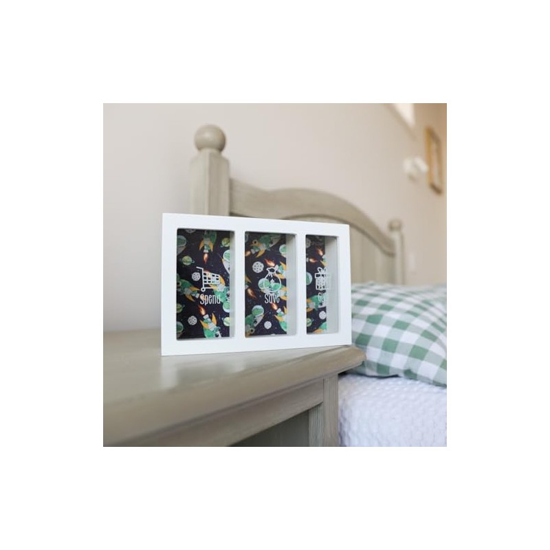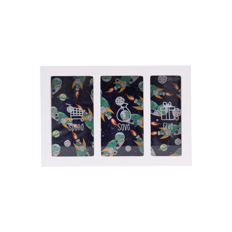 - Dino pattern money box, features 3 three slots to help kids spend, save and give