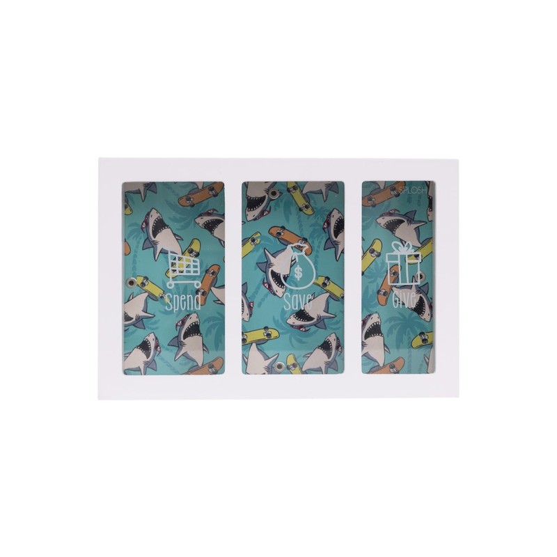 - Shark pattern money box, features 3 three slots to help kids spend, save and give