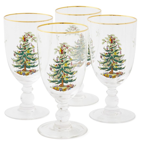 Spode Christmas Tree Glassware - Set of 4 -Made of Glass – Gold Rim- Classic Drinkware - Gift for Christmas, Holidays, or Wedding - Drinking Glasses (Pedestal Goblets)