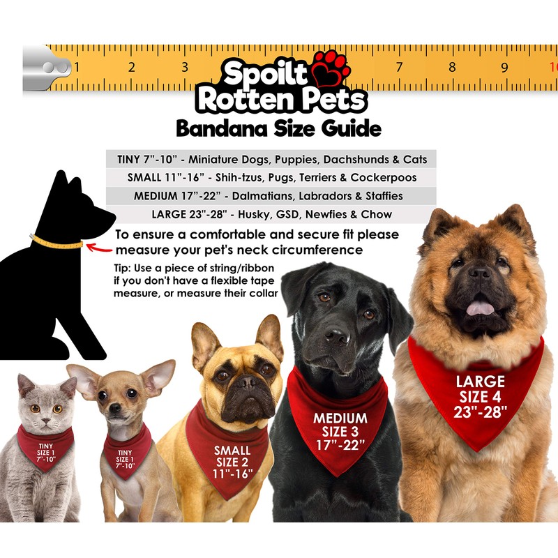 - Spoilt Rotten Pets exclusive design dog bandana. The only bandanas with sizing options to fit all dog breeds. No fiddly knot to tie - safe popper fastening for easy wear. Our Bandana's are made here in the UK using top quality fabrics. Delightful quality cotton fabric front with soft fleece reverse - So comfortable your dog won't notice they are wearing one!