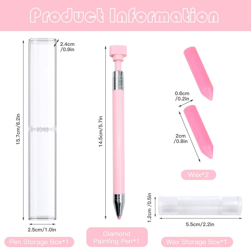 - 5D Diamond Painting Accessories Set: In this set, you will receive 1 pink diamond painting pen; 2 replacement wax cores. They are packed in delicate plastic boxes.