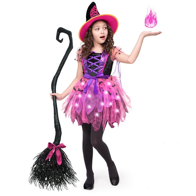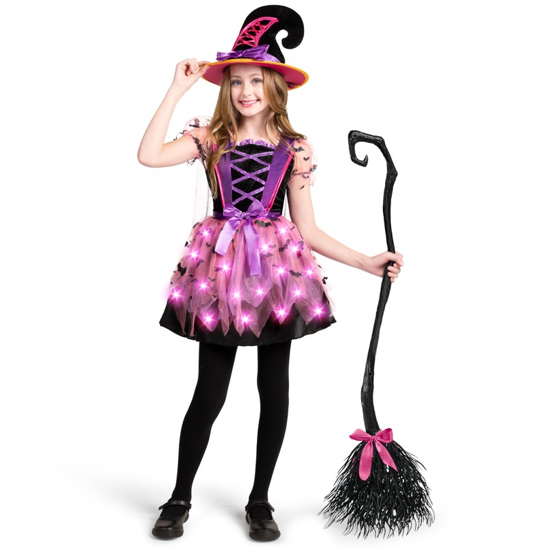 • Our witch costume for girls includes a hat, a witch dress with tutu skirt that lights up and a magic wand.