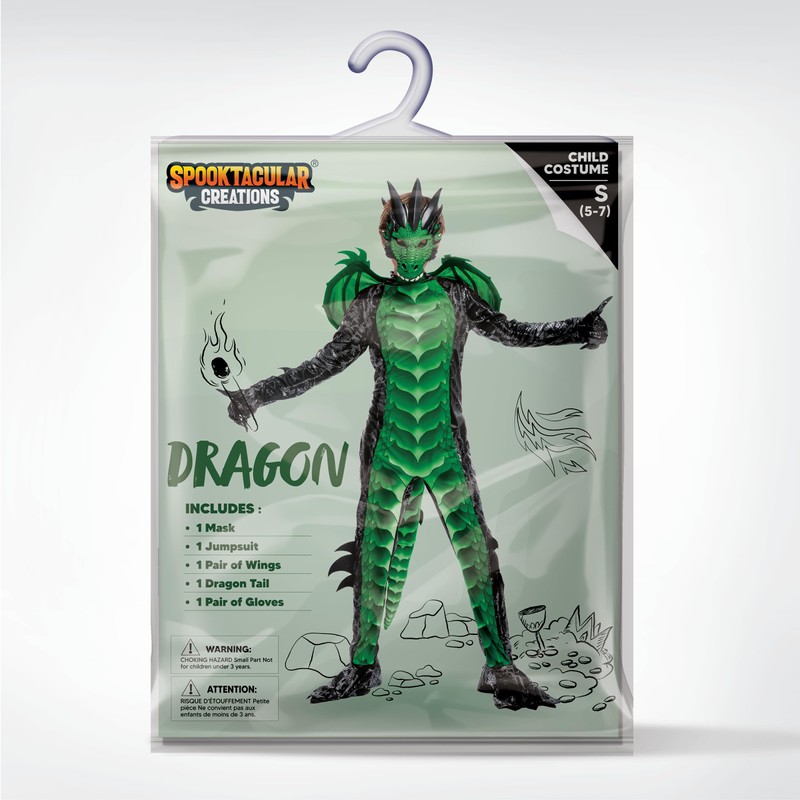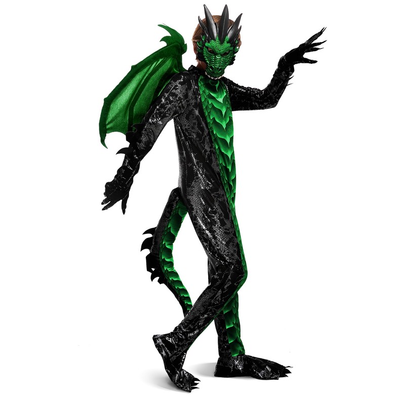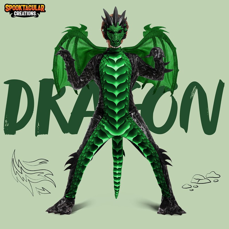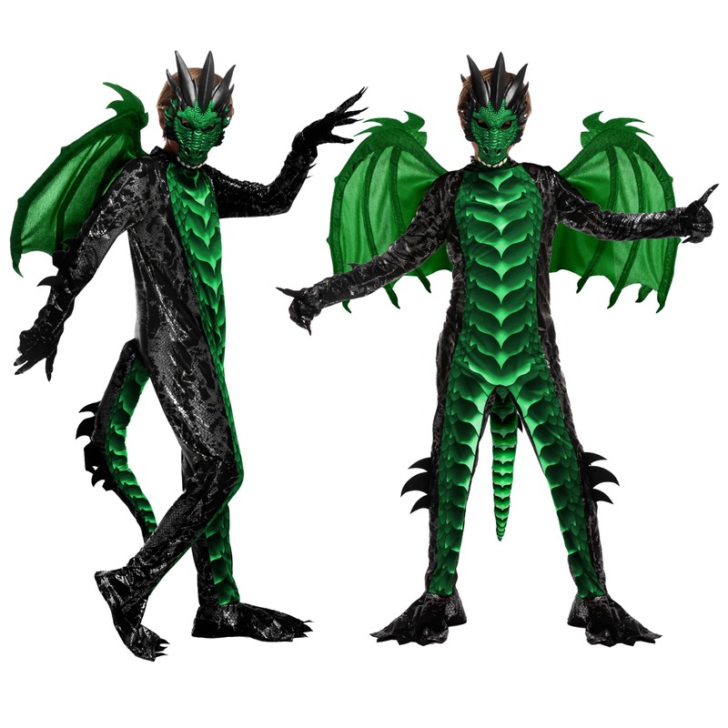- Super Value Pack: This green dark dragon costume set includes 1 dragon jumpsuit with tail, 1 pair of gloves, 1 mask and 1 pair of detachable wings. The dragon mask and gloves will give your child the full dragon experience, while the tail and detachable wings added a great touch to the costume.