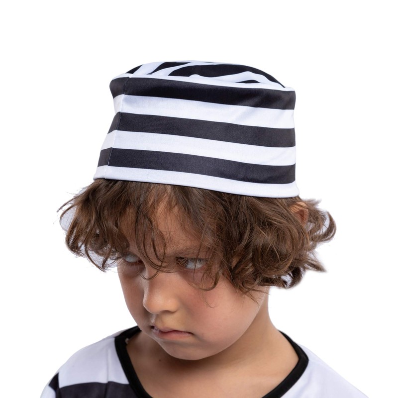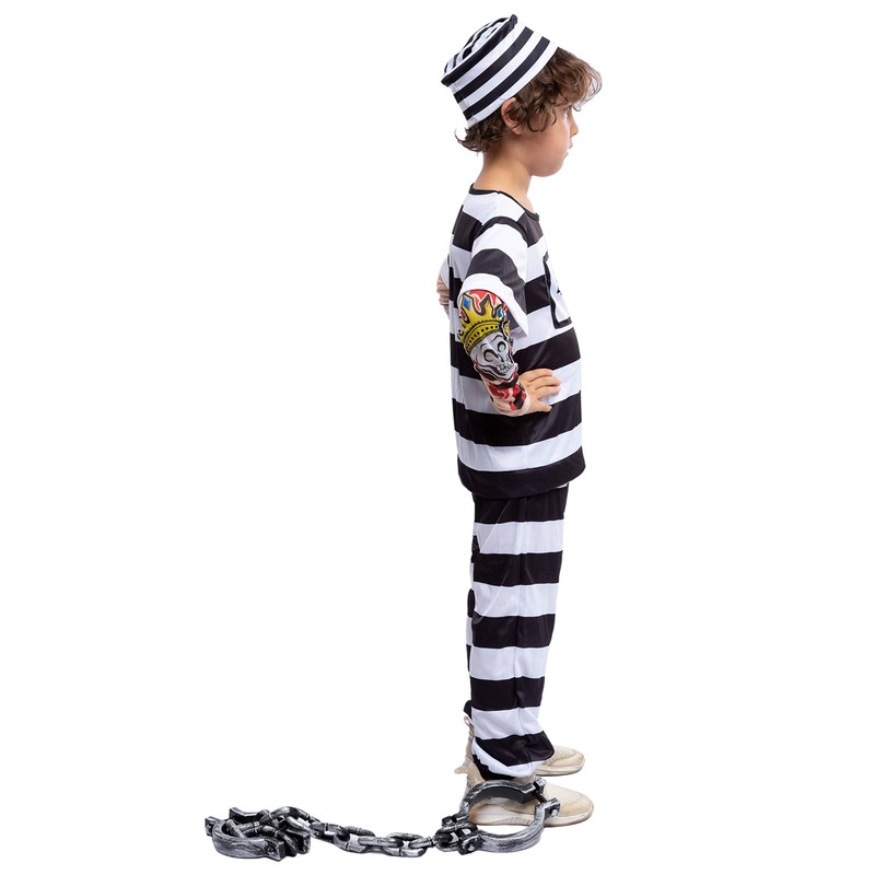 - Rollenspiel gestreifte Gefängnisuniform Halloween-Sträflingskostüm Enthält Jailbird-Hut, Balck und weiß gestreiftes Hemd mit angebrachten Tattoo-Ärmeln, Gefängnishosen und Spielzeughandschellen für Kinder.