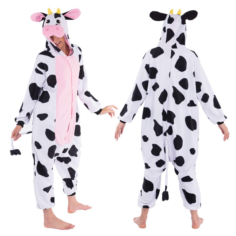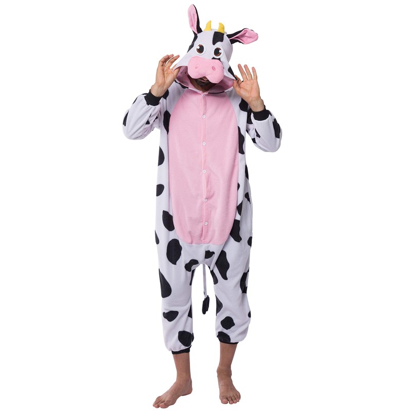 - Deluxe Version of Cow Pajamas One Piece plush dressing up Animal Costume jumpsuit. Adult Size:S(Small), M(Medium), L(Large), XL(X-Large), XXL(XX-Large). Made with High Quality Plush Fleece Materials.
