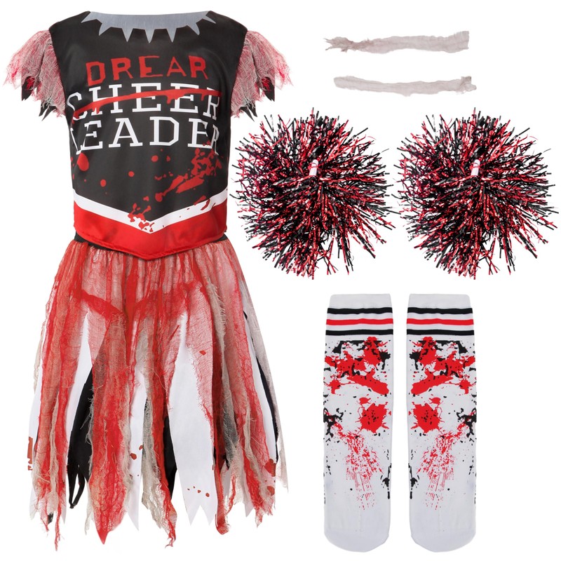 - Super Value Pack: This zombie cheerleader costume set includes 1 black and red top, 1 skirt, 2 hair ties, 2 pompoms, and 1 pair of socks. Transform into a spooky and undead cheerleader with this dark zombie cheerleader costume.