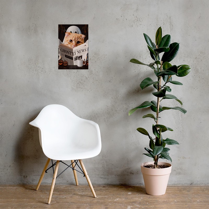 Spooky Halloween Pet and Ghost Reading Wall Art - Red Scottish Fold Cat Poster 12x18 Unframed Photo Paper - Funny Home Decor Gifts for Cat Lovers