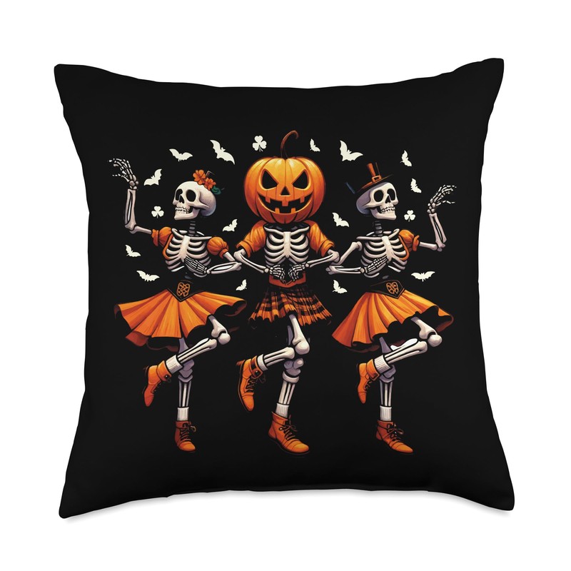 Spooky Pumpkin Skeleton Dancing Ceili, Irish Jig Dance Throw Pillow
