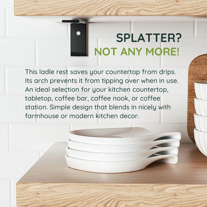 - SPLATTER? NOT ANY MORE! This ladle rest saves your countertop from drips. Its arch prevents it from tipping over when in use. An ideal selection for your kitchen countertop, tabletop, coffee bar, coffee nook, or coffee station. Simple design that blends in nicely with farmhouse or modern kitchen decor.