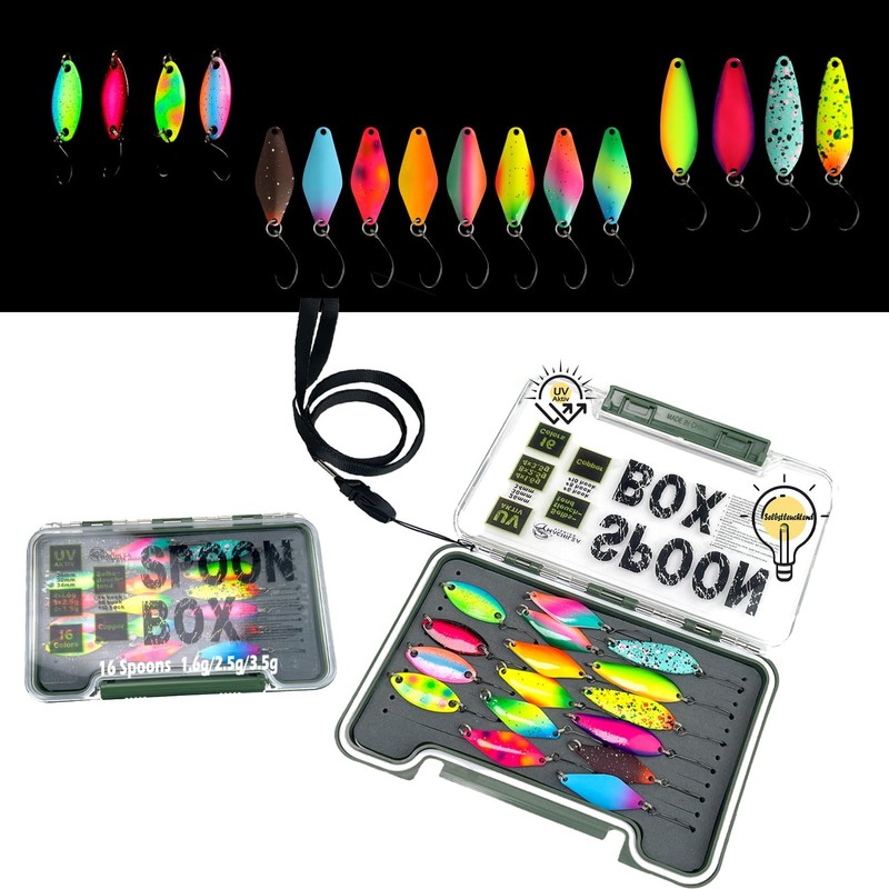 Spoons Forelle, 16x UV-Aktiv und Selbstleuchtend Forellenköder, Machilea Kupfer Spoon Set mit Box, Forellen Köder Forellen Angeln Blinker Forellen Spoon Angelköder 1.6g/2.5g/3.5g