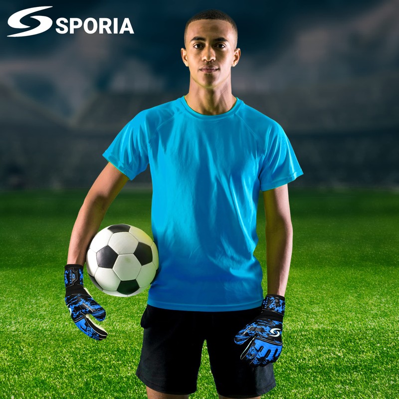 - STRONG GRIP PERFORMANCE & CONTROL: SPORIA soccer goalie gloves are made of 12MM natural latex foam with practical design representing bigger palm surface, larger area of auxiliary buffering, high viscosity, good effect of slippery proof, and can maximize friction. In addition, the catch now has more stability to the gloves' curved form. Even on snowy and wet days, it delivers exceptional holding power and grip