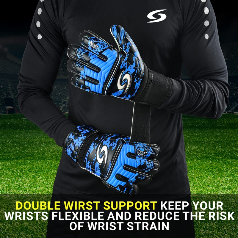 - DOUBLE WRIST PROTECTION: These goalkeeper gloves feature a double wristband design with an inner wristband made of a woven elastic band, and an outer protective band that can be adjusted in size using velcro and fits tightly to the inner wristband. It prevents the inner wristband from falling off during training while sustaining wrist flexibility and lowering the risk of wrist strain