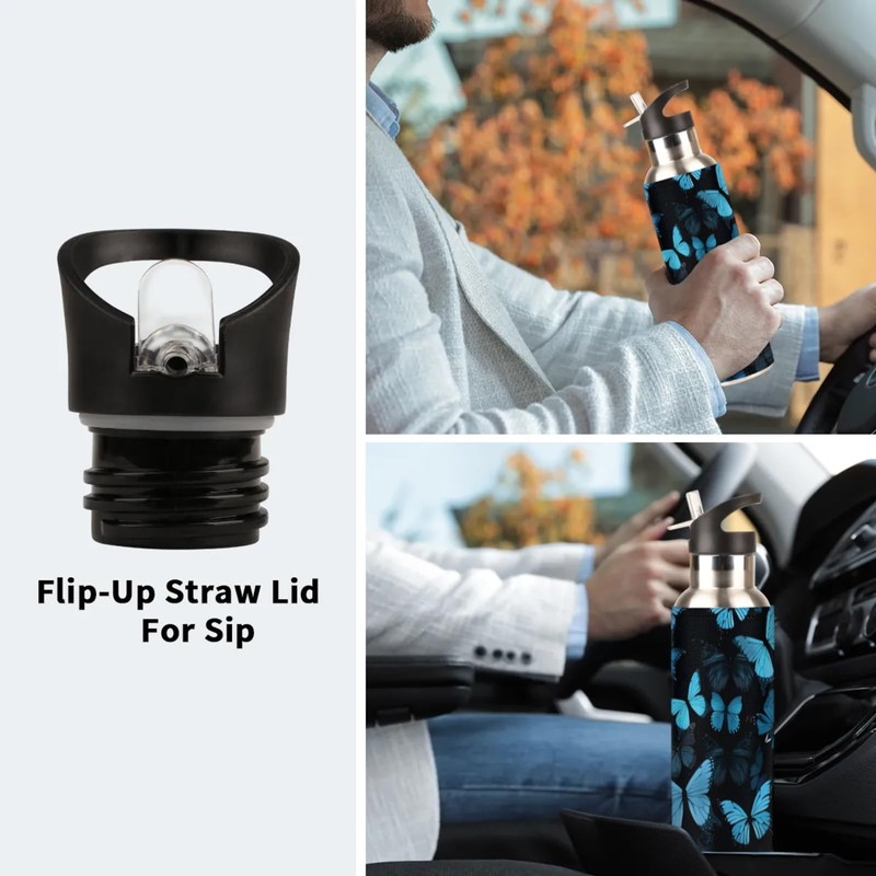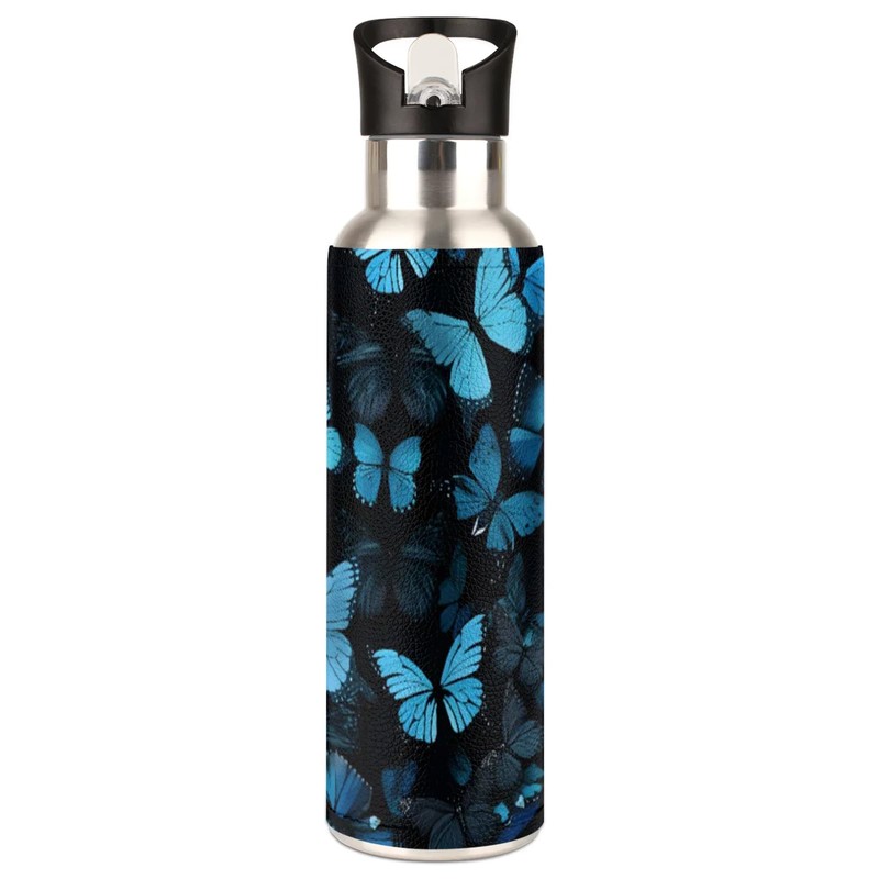 Sport Water Bottles, Insulated Water Bottle for Men Women, 600ml (20oz) Stainless Steel Gym Water Bottle, Kids Cups With Straws and Lids Leak Proof Thermos for Hot Drinks&Cold Drinks Blue Butterfly