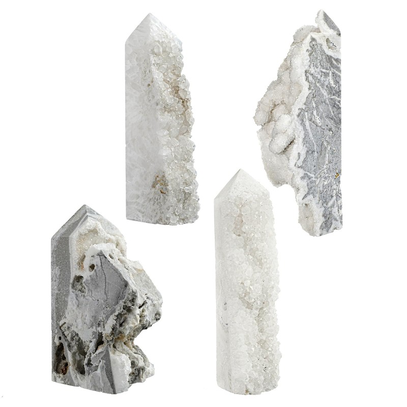 - Natural Rock Crystal Geode Tower: This stunning tower is made from natural rock crystal geode and is not artificially color-enhanced, allowing the true beauty of the stone to shine through. The obelisk-shaped stone wand features a flat bottom and smoothly polished edges, making it perfect for decorating desks, tables, window sills, and shelves.