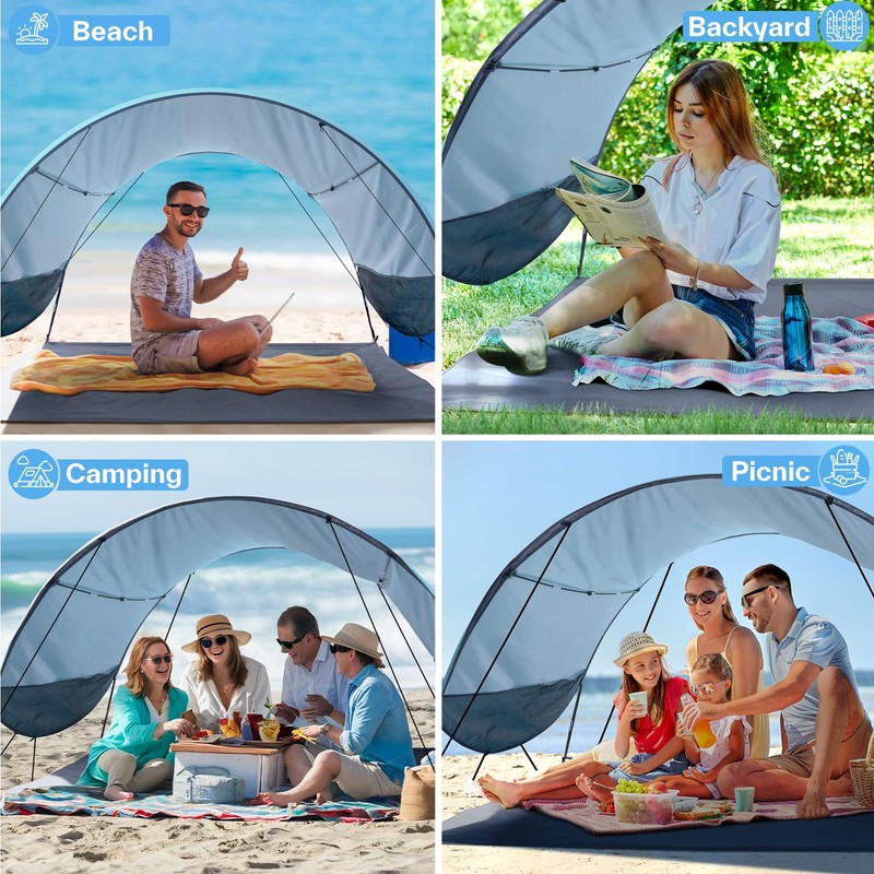 - Compact and Portable: 8×4.5ft beach canopy tent suitable for 2-3 people, enough space to start a summer sunshine journey with your family and friends. Weigh about 6 pounds, comes with a portable carrying bag easy to carry. Our beach canopy comes with a built-in ground cloth, so you will no longer need to carry an additional blanket for the trip. The beach tent sun shelter is not only suitable for the seaside, but you can also use in the backyard or outdoor while camping.