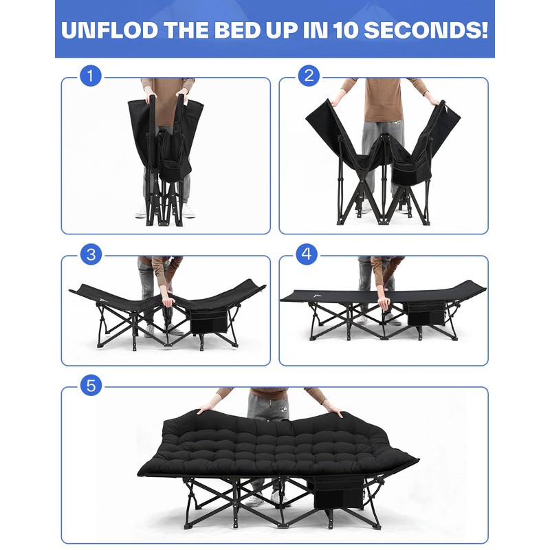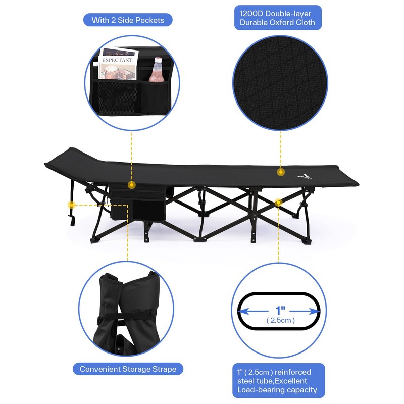 - Double sided Pocket Design: The two lagre pockets of sleeping cots for adults keep all your things handy right next to you! The ultra convenient side pockets store sunglasses, books, phones, headphones, water bottles and so much more!