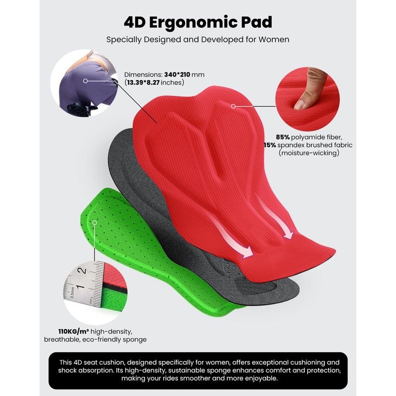 - 4D Cushion for Ultimate Comfort: Crafted for women, this women bike shorts boast ergonomic design that absorbs shock, relieves pressure, and protects sensitive areas, making long rides smoother and more enjoyable.