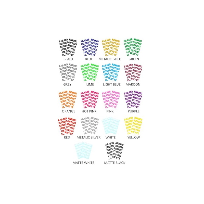 - 18 Available colors Black Matte Black White Matt White Blue Light Blue Green Lime Green Yellow Orange Red Maroon Metallic Gold Metallic Silver Grey Pink Hot Pink Purple