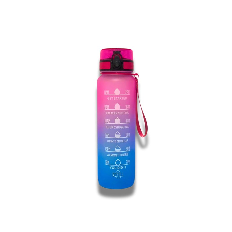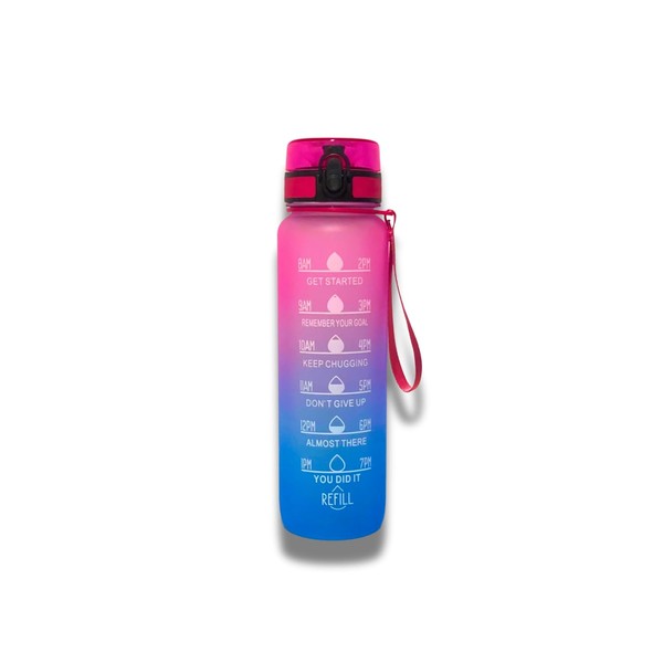 Sports Water Bottle 1L / 32OZ, BPA-Free, Motivational with Time Markings Leakproof Drinking Bottle for Running, Gym, Cycling, School, and Outdoor Activities (Pink - Blue)