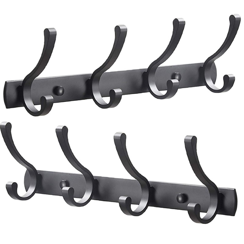 Spotact 2pcs Wall Mounted Coat Rack, 4 Dual Hooks for Hanging Coats Black Towel Hanger 13.8”x1.3” Anti-Rust Clothes Hook for Entryway, Bathroom, Room, Kitchen (4 Hooks(2 Packs))