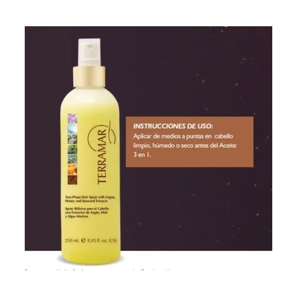 Recupera la vitalidad de tu cabello con el Spray Bifásico Reparador Terramar 250 ml, un tratamiento innovador que combina nutrición intensa con protección diaria. Su fórmula bifásica hidrata profundamente, repara las fibras capilares y aporta un brillo radiante sin dejar residuos grasos.