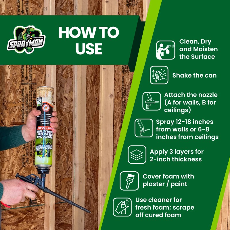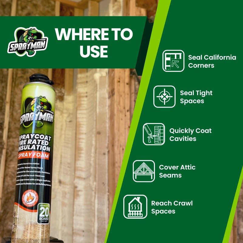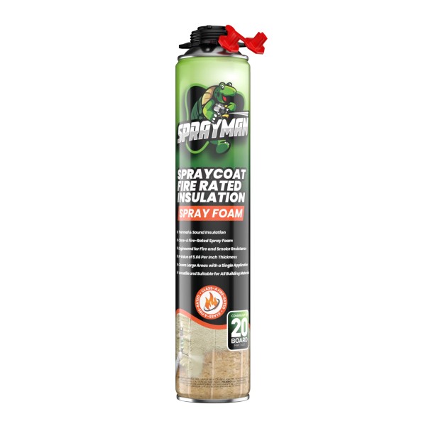 Enhance your home’s safety and comfort with easy-to-use SPRAYMAN Spraycoat, a premium-quality fire resistant spray foam. This closed cellpolyurethane foam spray delivers superior thermal and acoustic insulation while providing advanced fire protection—certified Class A Fire Rated (ASTM-E84 / UL 723). Ideal for DIY spray foam insulation projects and professional installations, SPRAYMAN Spraycoat combines ease of use and reliable performance without any increase in spray foam insulation price compared to standard foam kits.