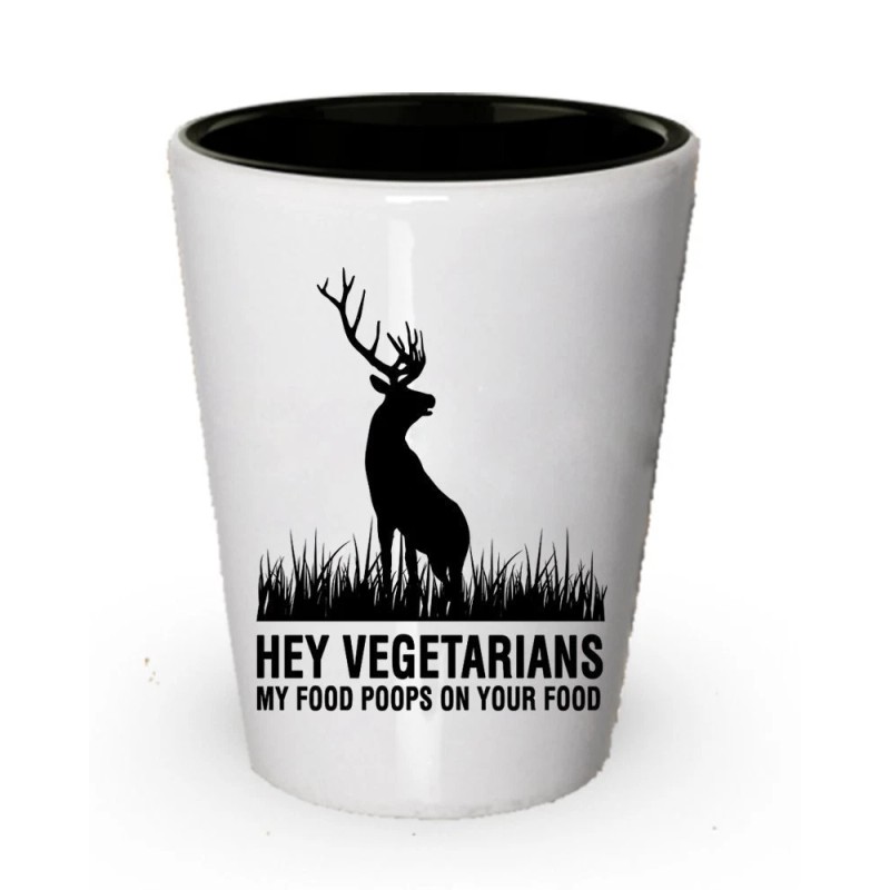 SpreadPassion Funny Hunting shot glass- Hey Vegetarians, My Food Poops On Your Food