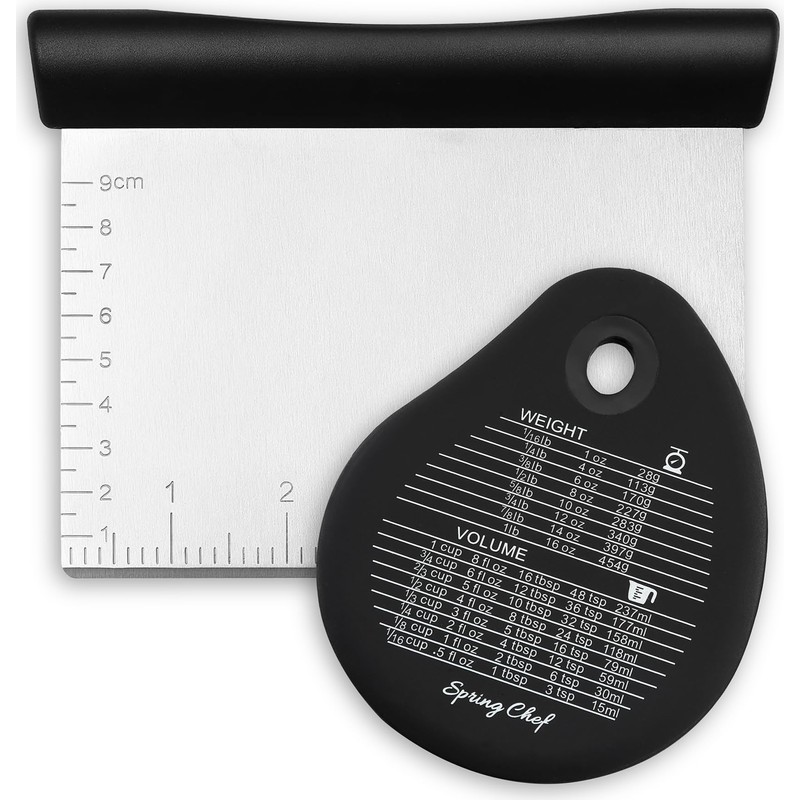 - Bonus Bowl Scraper: Get every last bit of dough or batter from your bowl with the handy included bowl scraper. Also has a convenient measurement conversion chart printed on the surface for quick reference any time. Scrape flat surfaces with the dough scraper and scrape curved surfaces with the bonus bowl scraper.