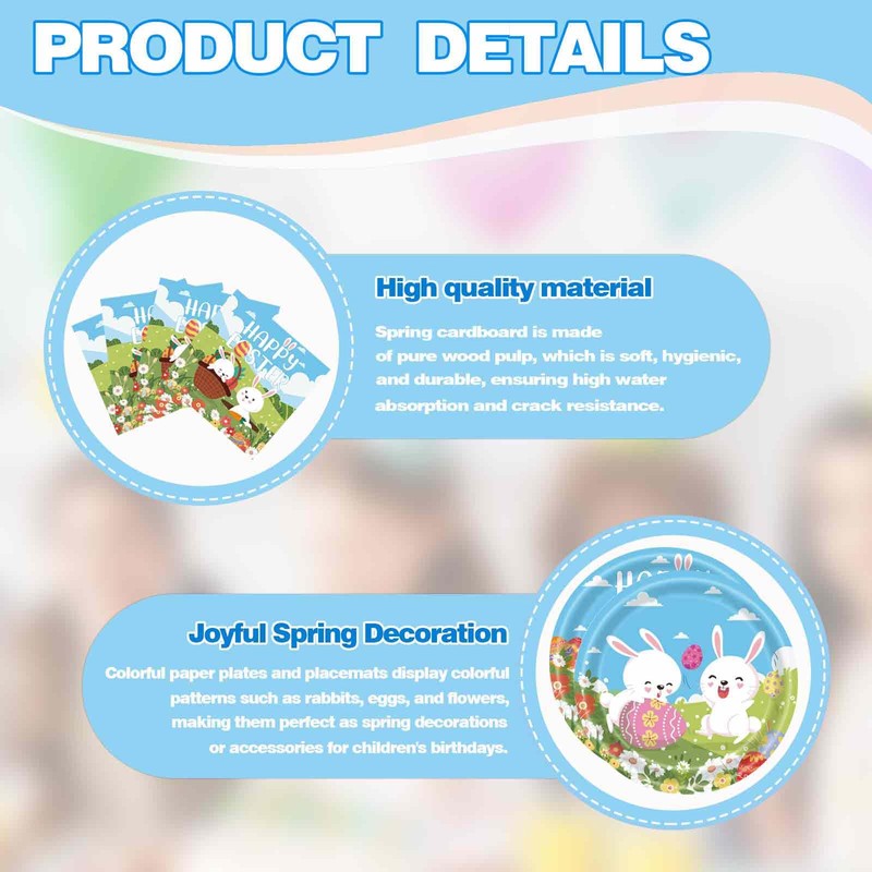 - MERRY SPRING DECORATION The colored paper plates and placemats feature colorful motifs such as rabbits, eggs and flowers, perfect for spring decoration or children's birthday accessories.