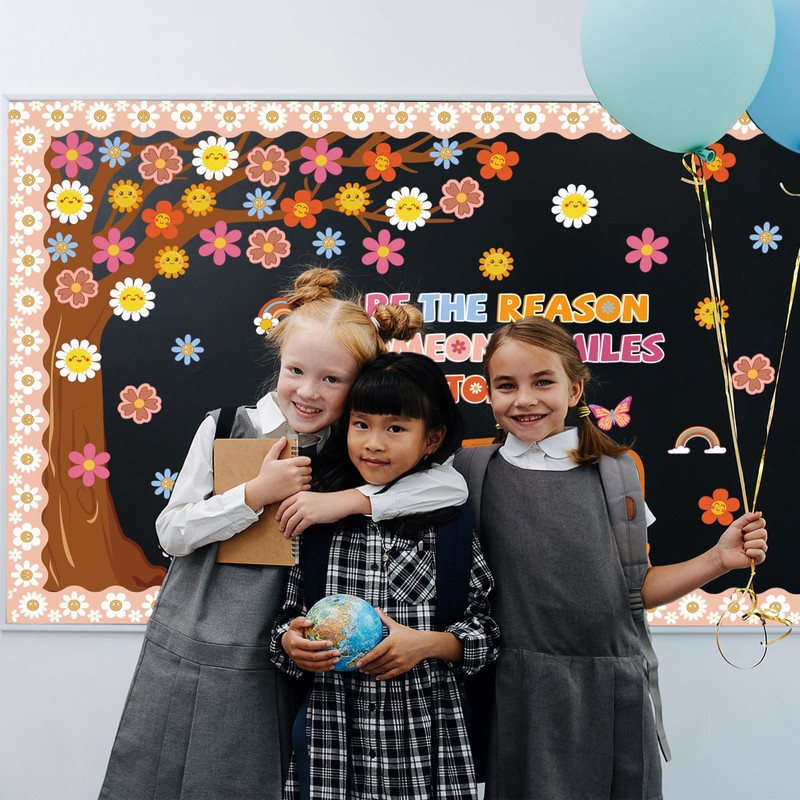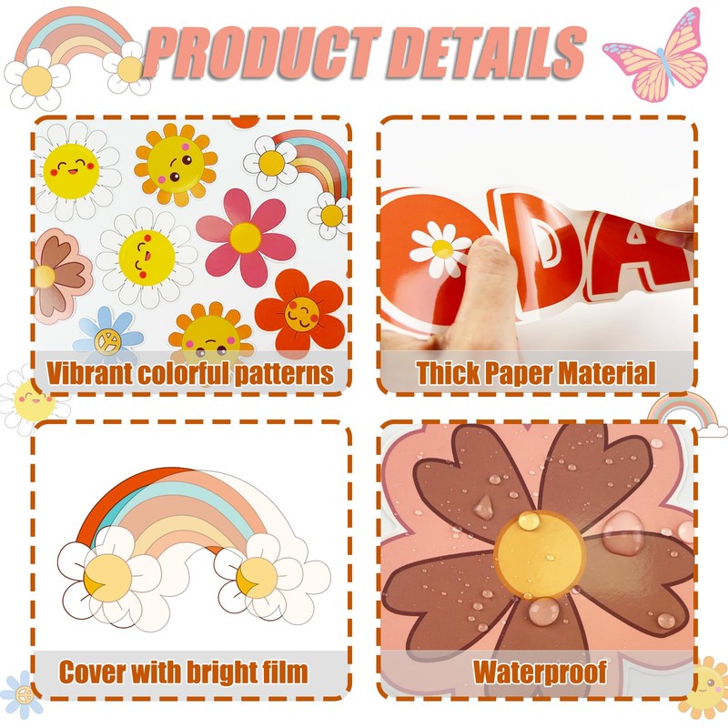 - Package Includes: This spring flower bulletin board decorations set includes a 'BE THE REASON SOMEONE SMILES TODAY' letter cutout, 36 hippie daisy cutouts(6 styles), A hippie bus cutout, A big groovy tree cutout, 2 hippie butterfly cutouts, 2 rainbow cutouts, 16 daisy scalloped bulletin board borders, also comes with 80 glue points. The ample quantities enable you to exercise your creativity, freely mixing and matching elements to transform your space into a vibrant, colorful world.