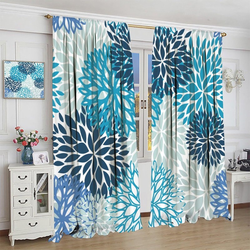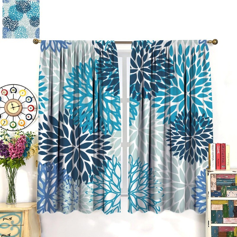 Spring Navy Flower Curtains, Blue Boho Chrysanthemum Flowers Colorful Bright Boho Window Treatments for Kitchen Living Room Bedroom Drapes 2 Panels 42x45 Inch