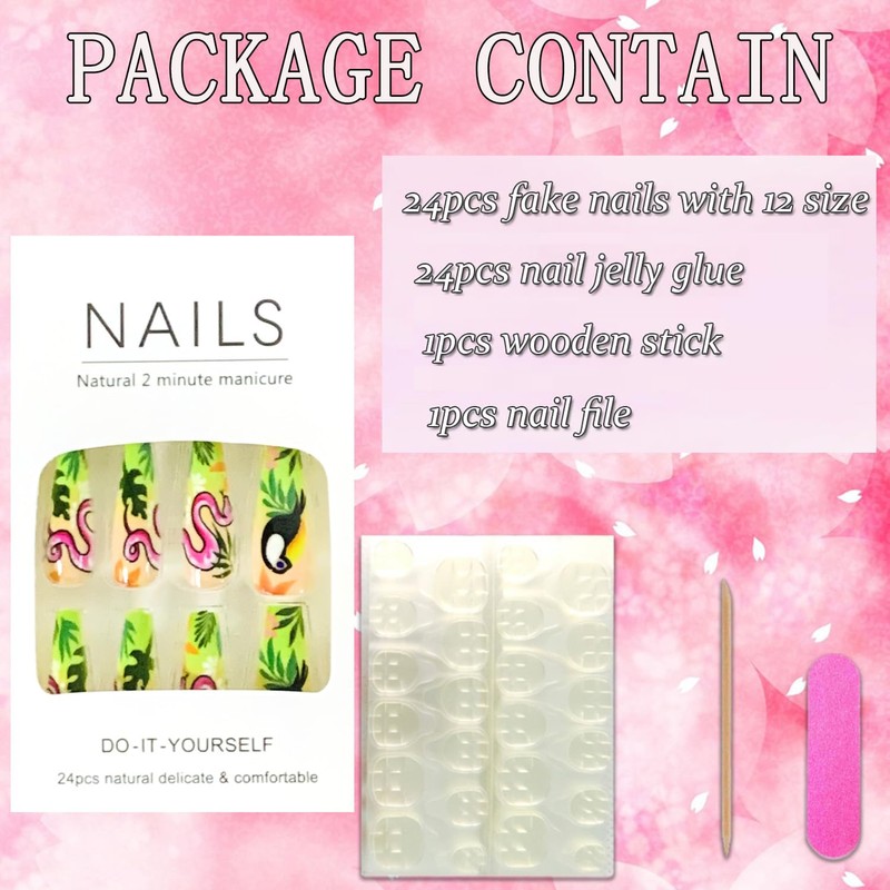 - 【False Nails Sets】You'll get 24 extra long coffin false nails in 12 sizes. 1 mini nail file, 1 small wooden stick, 1 piece of press on nails adhesive sticky tabs.