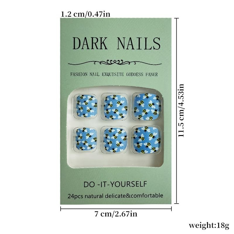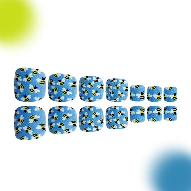 Spring Press on Toe Nails Blue Fake Toenails with Yellow Bee Designs Animals False Toe Nails Short Square Glue on Toenails Summer Stick on Toe Nails Cute Acrylic Toenails Artificial Toenails