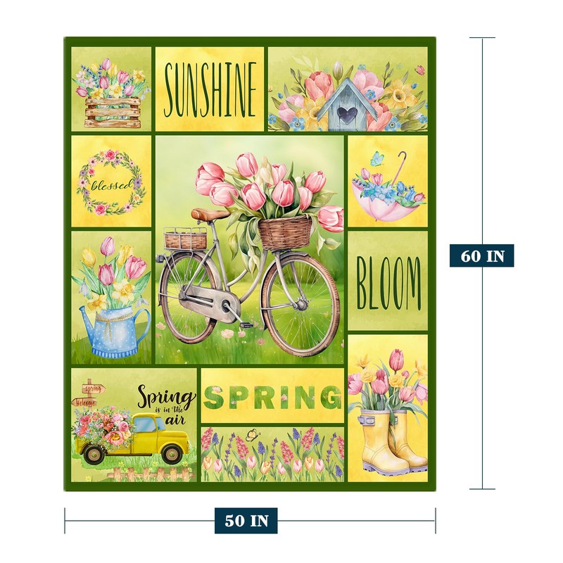 - ★ SPRING HOLIDAY GIFT BLANKET★ : The farmhouse spring summer flower blanket is your perfect holiday gift choice, very suitable for family,women, men, girls,boys, dogs and pets, etc.The plush spring theme blankets are not only warm blankets for couch,sofa,bed and car, but also bring a stylish and unique holiday atmosphere to your bedroom and living room.The spring floral throw blanket is with sweet bike tulip flower pattern, which is a perfect addition to your holiday home decorations.
