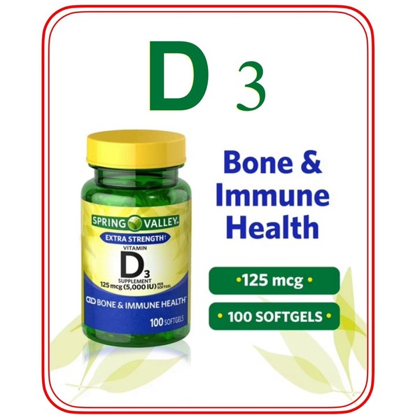 • One 100 count bottle of Spring Valley 5,000 IU Vitamin D3 Softgels