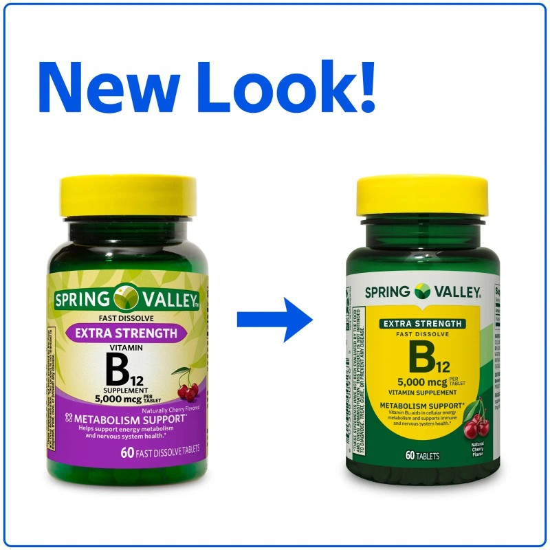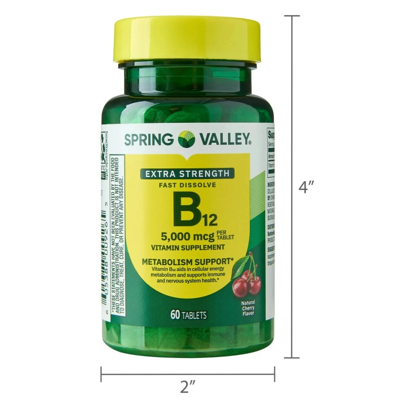 - Spring Valley Extra Strength Vitamin B12 Fast Dissolve Tablets for Metabolism Support, Cherry, 5000 mcg, 60 Count.