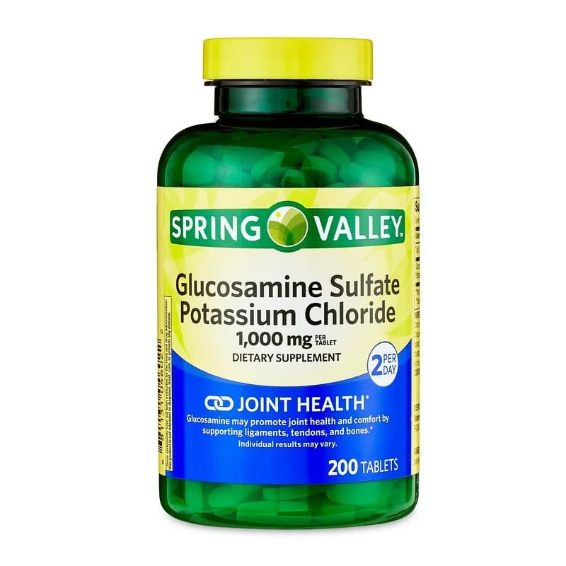 - Spring Valley Glucosamine Sulfate Potassium Chloride Tablets Dietary Supplement, 1,000 mg, 200 Count 1,000 mg of glucosamine sulfate potassium chloride per tablet No gluten, lactose, artificial dyes or flavors 1 tablet twice per day 200 tablets per bottle for over 3 months (100 days) of supply