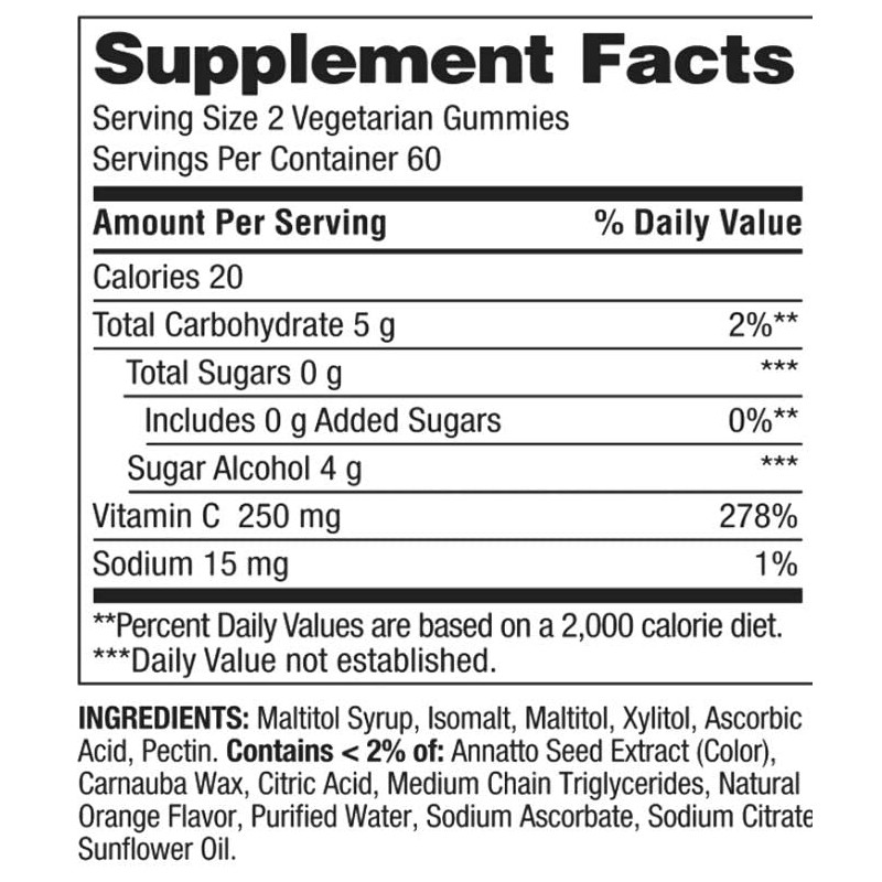 - 250 mg of vitamin C per serving Zero sugar and vegetarian formula Delicious natural orange flavor