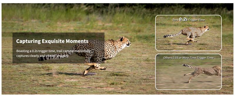 Featuring a 4W trail camera solar panel and a 7800mAh rechargeable battery, these solar powered trail camera guarantee a constant power supply, eliminating the hassle of frequent takedowns and charging. No need to charge for 365 days.With an IP66 waterproof rating, they are designed to withstand diverse environments, ensuring their long-lasting performance. Provide an ideal solution for outdoor use.