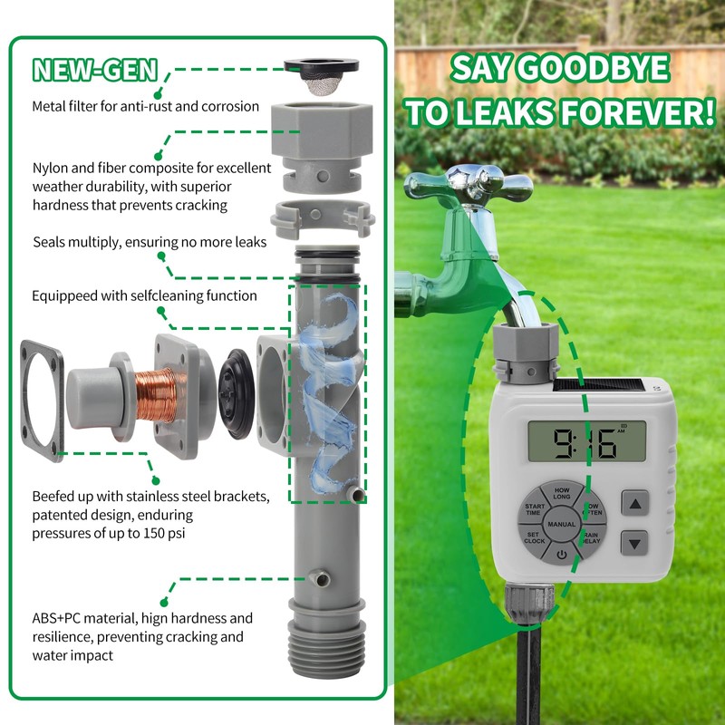 - TOTALLY LEAK-PROOF - NEWLY UPGRADED WATER VALVE: Our upgraded water valve features a nylon and fiber composite for superior U/V resistance and weather durability. Its high hardness and toughness prevent cracking and withstand water impact. The stainless steel filter mesh resists rust and corrosion, while the internal valve’s self-cleaning function ensures smooth and reliable operation of the irrigation system