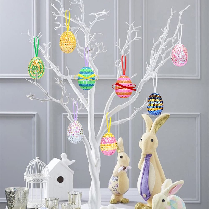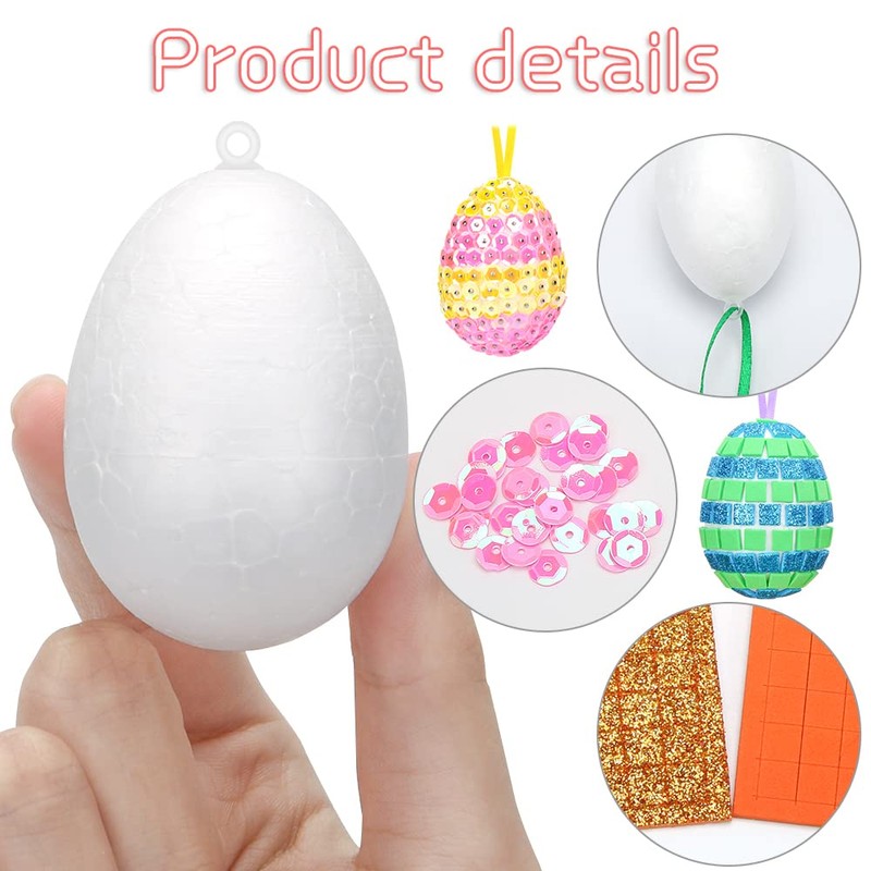 - Easter egg craft set: the Easter decoration craft set contains 25 high-quality polystyrene eggs, 8 colourful sequins in different colours and 8 coloured EVA stickers. 25 plastic hangers, colourful ribbons for hanging and craft pins.