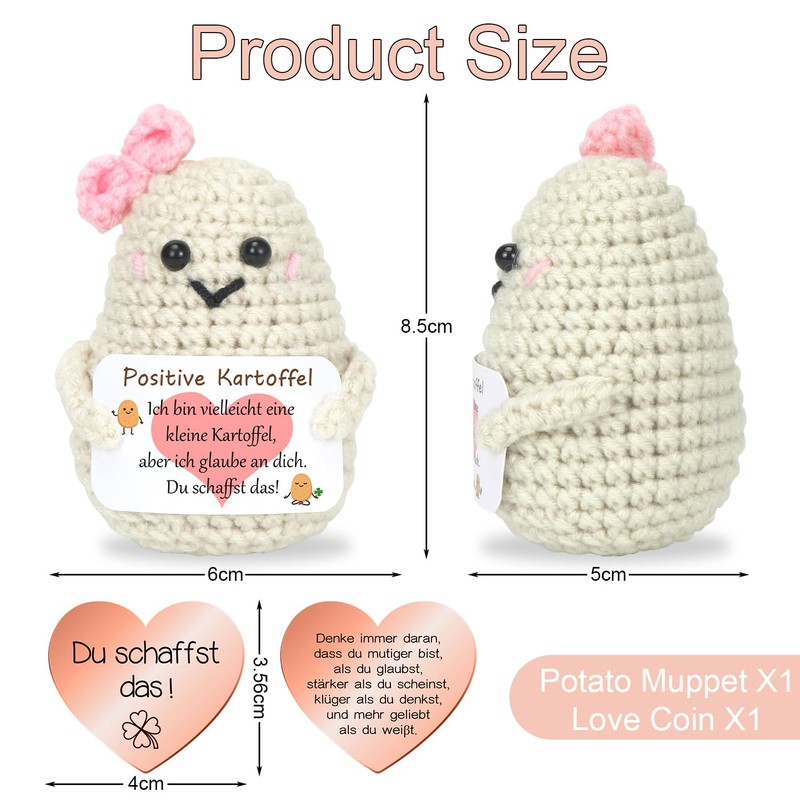 - Positive potato: a creative knitted potato doll with positive energy cards and heart shape rose gold lucky charms. It is very suitable as a farewell gift or encouragement gift. It can be given to colleagues, girlfriends, friends who are in a difficult phase, people who have not seen you for a long time. Give them warmth and strength.