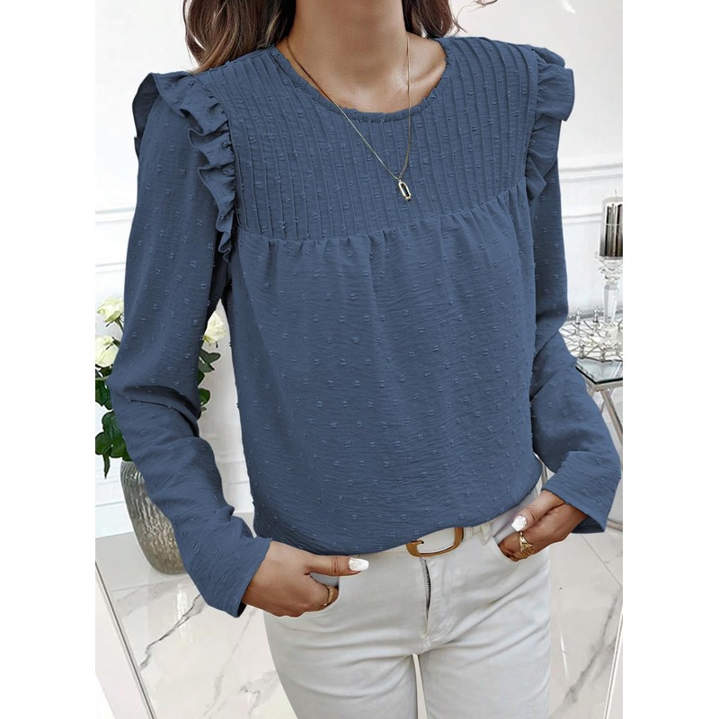 - FASHION DESIGN: Long Sleeve shirt for women / Swiss Dot design for a Fashion and Charming look/ Pleated Crew Neck / Ruffle Casual Top