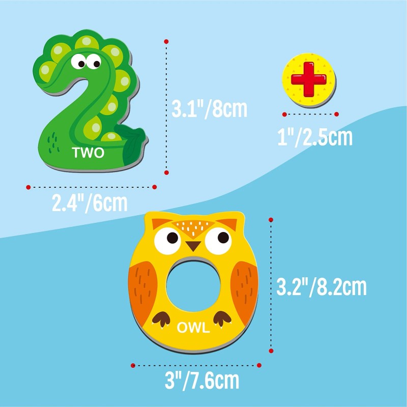 UNIQUE DESIGN: 26 large magnetic uppercase letters with vivid animals on each representing the letter, like A for alligator. The set also includes 0-9 numbers and three math symbols (plus, minus, equal), helping learn basic and simple mathematic operation. It is a very cute set of learning toys.