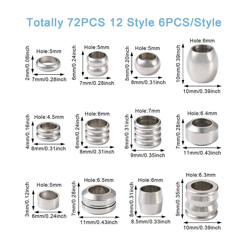 - Package: You will receive 72 stainless steel beads, 12 styles, 3 shapes (Rondelle & column & barrel), stainless steel color, detailed size, please refer to the product details