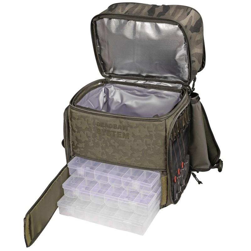 Spro Double Camou Deadbait System Backpack 24 x 35 x 42 cm - Backpack - The fishing bag from Spro is a good backpack that offers plenty of space for your fishing equipment. The base contains four bait boxes, the middle section is a cooler bag for storing bait fish with an easy to clean and removable lining. The large top compartment offers additional space for your fishing gear, the side pockets offer space for leaders and rigs. Bank sticks can be transported on the back, for example.