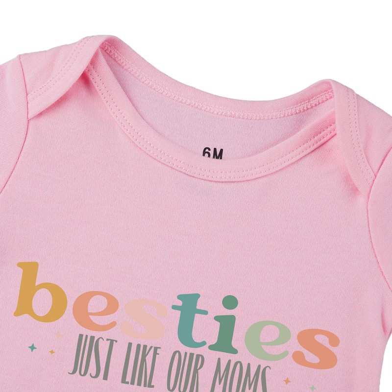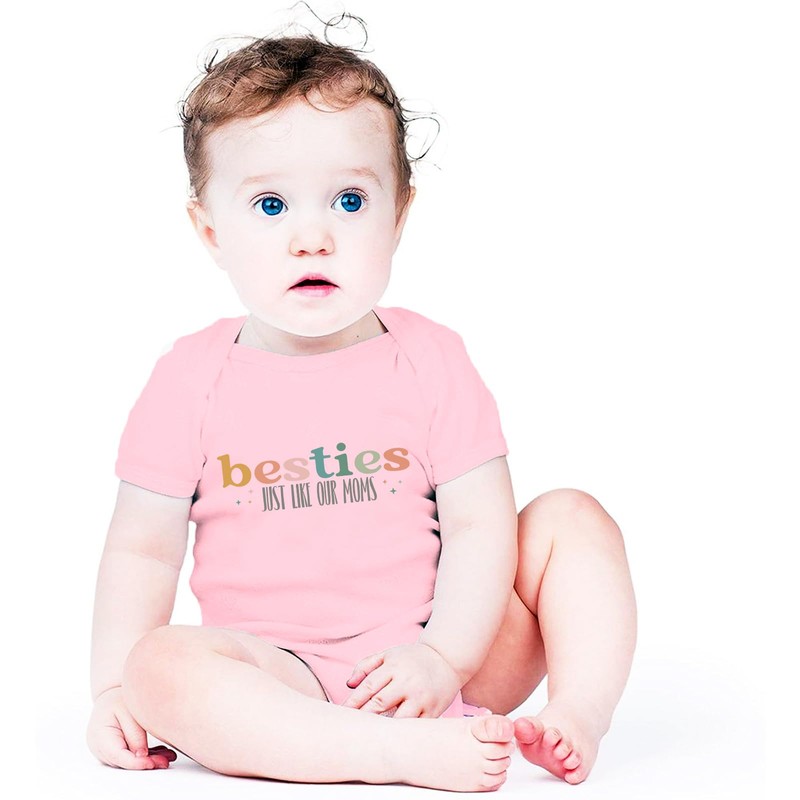 - Design: Baby onesie printed with funny letters "besties just like our moms"graphic, unisex baby bodysuit.Expandable neckline design,easy for putting on and taking off;bottom snap closure neutral newborn onesie, easy to change diapers.