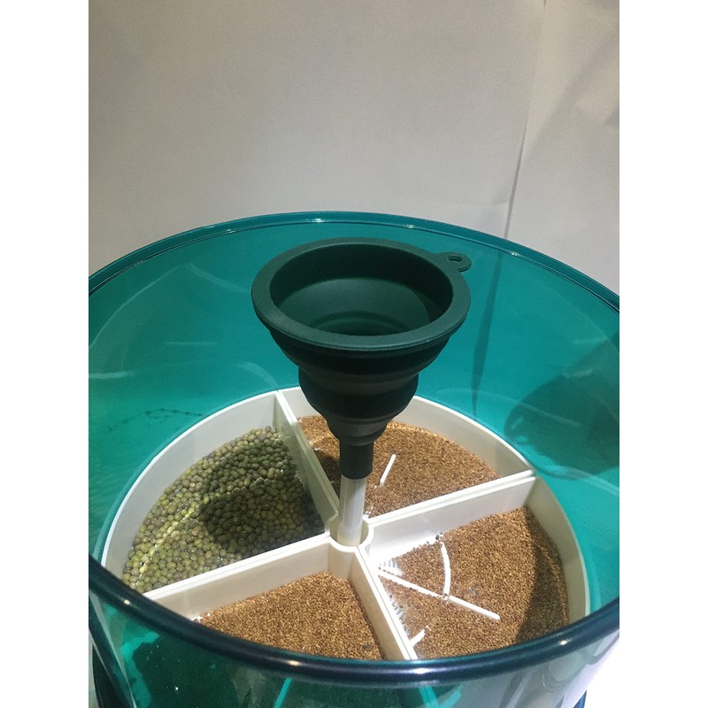 Silicone Refill Funnel - Easily refill Spouter with fresh water without taking the SpoutStacker apart. Funnel fits on top of the center water pipe to add clean water directly down to the reservoir. First use the draining tube that is included with the Sprout Stacker to pump out the used water. Then fit the funnel on top of the center water riser pipe. Pour clean water into the funnel to directly fill the bottom water reservoir. No taking apart the machine, no need to remove any of the sprouter barrels to refill the water!