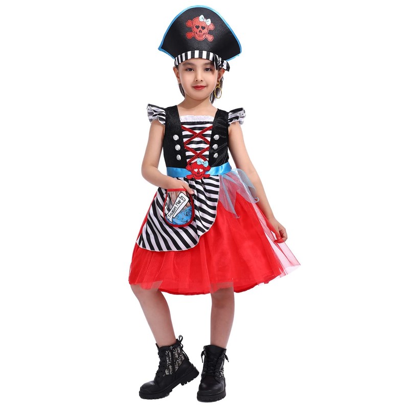 - 【Premium Quality Pirate Dress For Girls】This pirate costume dress is made of higher quality fabrics, the type of the materials is like for like but the fabric weight for each kind of fabrics for this dress is higher than the level.Plus we have used safe stitching for skirt sideseams,it's more durable and withstand for times of washing and wearing.All the accessories are made of new raw materials, sword is durable for bending and playing with.