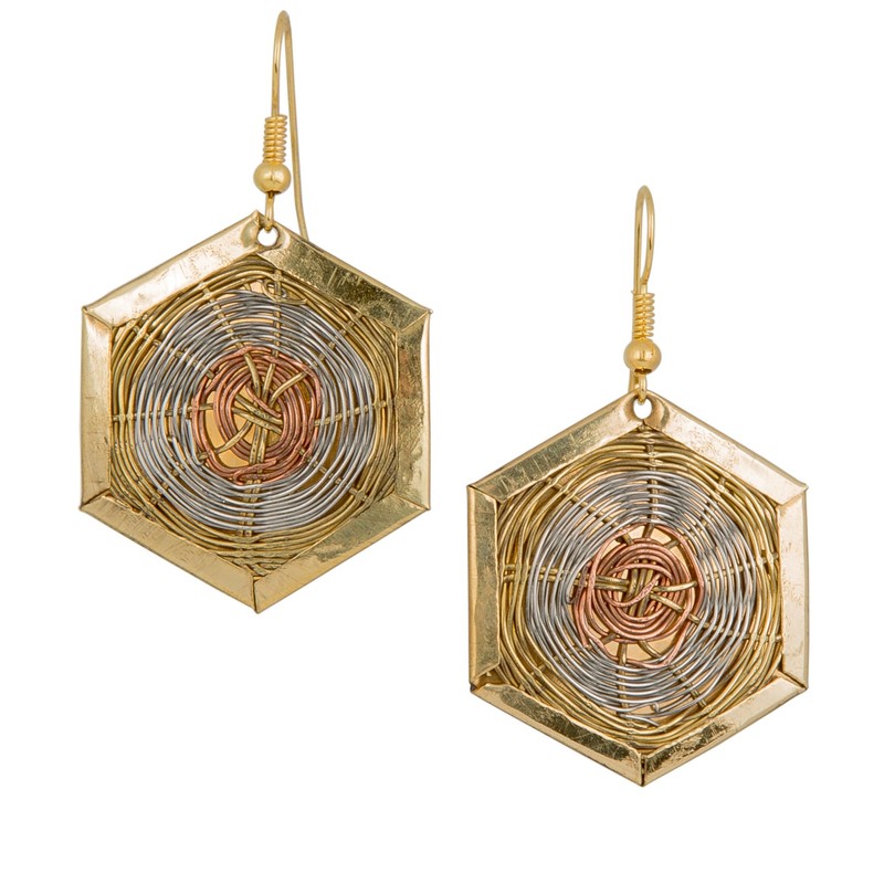 - Lightweight hand-made hexagon basket weave earrings make a beautiful artisan boutique statement: they are both modern and tribal, simple and complex, 3 tones mean it goes with everything... Copper, silver & gold. Each one is formed by hand, so the inside is unique. When you purchase one of these designs, you are purchasing your own unique piece of wearable art.